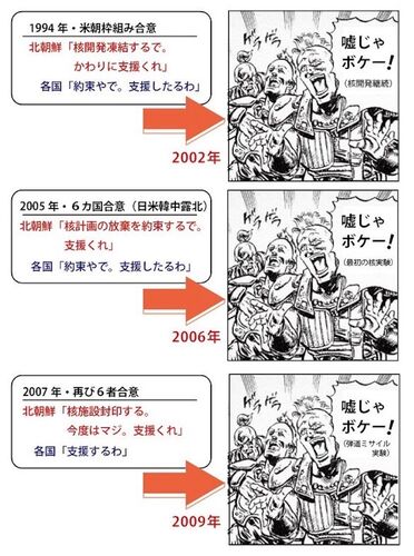 1994年 米朝協議 北朝鮮「核開発凍結する。支援くれ」→2002年「嘘じゃボケー!」核開発継続 2005年 六カ国合意 北朝鮮「核計画の放棄を約束する。支援くれ」→2006年「嘘じゃボケー!」最初の核実験 2007年 再び六カ国合意 北朝鮮「核設備封印する。支援くれ…