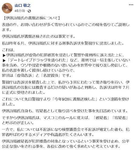 伊藤詩織は山口敬之氏に対する「虚偽告訴」「名誉毀損」で2020年9月28日に書類送検(送致)されている。 https://hanada-plus.jp/articles/250 「詩織」と名乗る女性の勇気ある告発! 2017年5月29日、「詩織」と名乗る女性が、東京・霞が関の司法記者クラブ…